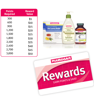 Upon signing up, you’ll instantly start collecting 1 point for every $1 spent on almost anything in store, and redeem points for discounts at specified point levels. Plus, collect points even faster by earning double points on participating Pharmasave Brand and WellQuest products!*